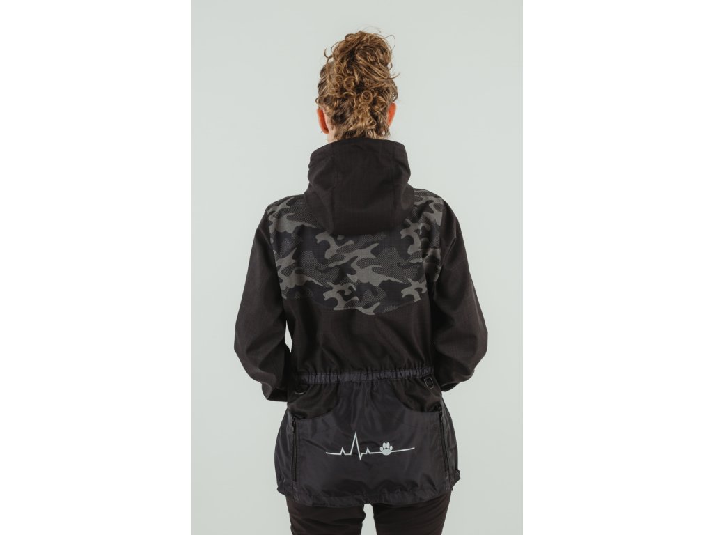 Černé části - spodní kapsy 100 % polyamid se zátěrem, bundu chrání v částech, kde přicházíte nejvíce do kontaktu se psem, otíratelný, odolný. Bez podšívky. Dole na stažení, vzadu v pase všitá guma. Dvoucestný kostěný zip YKK.