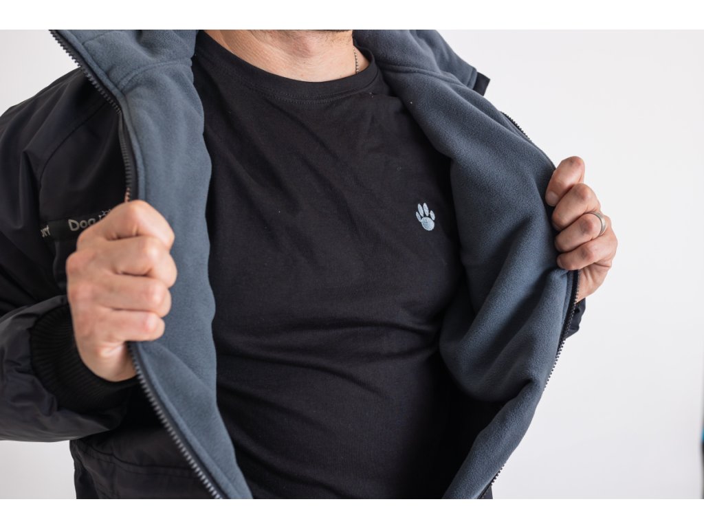 Gray fleece lining in hood, front and back. In the sleeves, the jacket has fleece with a smooth lining.