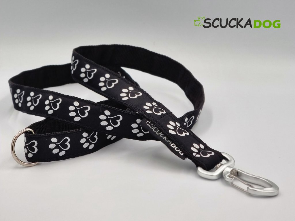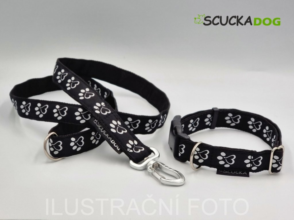 Lehké pevné vodítko, popruh šíře 25 mm s našitou ozdobnou stuhou.Délka vodítka 120 cm.V uchu vodítka kroužek pro zavěšení kolem ramen.