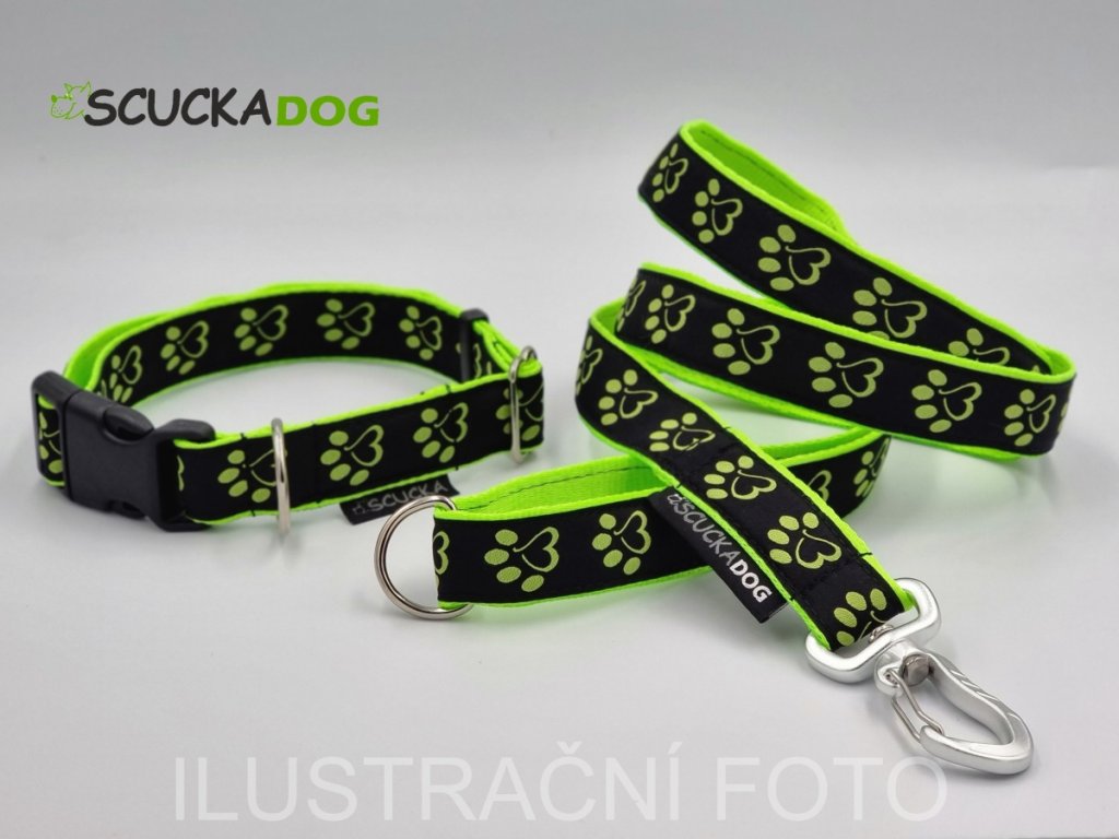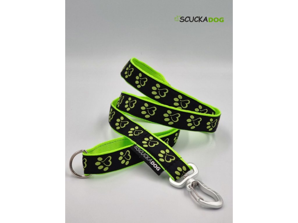 Lehké pevné vodítko, popruh šíře 25 mm s našitou ozdobnou stuhou.Délka vodítka 120 cm.V uchu vodítka kroužek pro zavěšení kolem ramen.